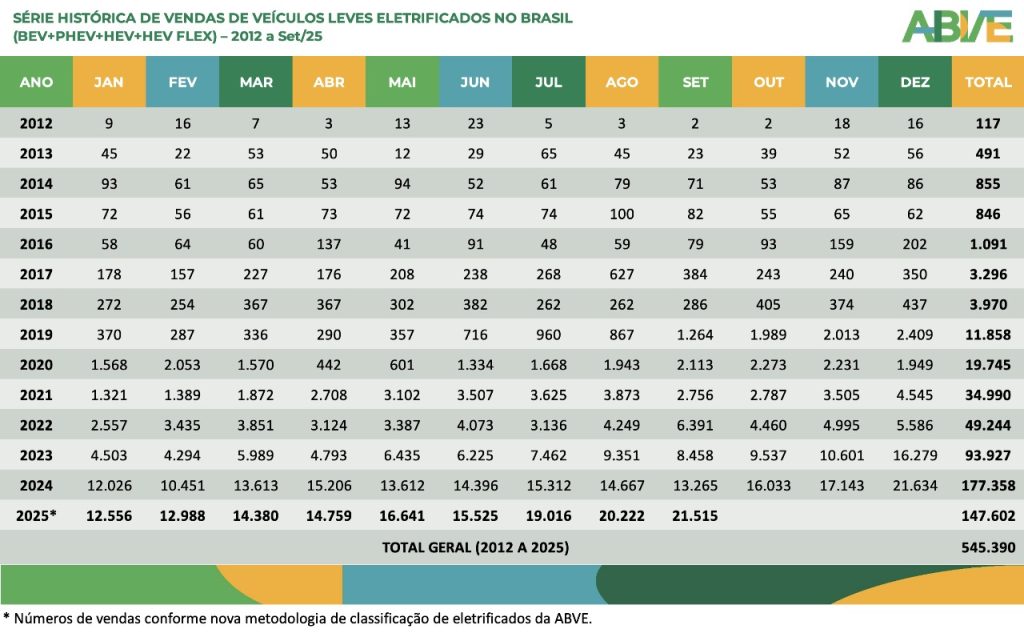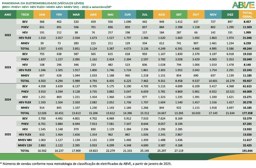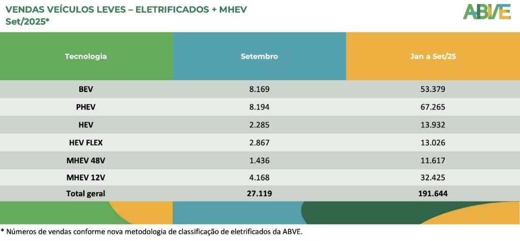 De janeiro a setembro, o mercado já soma 147.602 unidades eletrificadas, um crescimento de 20,4% em relação ao mesmo período do ano anterior.